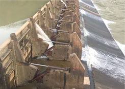 翻板壩阻水,經(jīng)不住洪水的沖擊,易被漂浮物卡塞或上游淤積造成不能自動(dòng)翻板,容易被洪水沖壞壩體影響防洪安全。洪水過后翻板門再關(guān)上時(shí)被異物卡住,造成大量漏水,一旦淤積厚度較大或泥沙板結(jié),閘門就不能正常回門(眾多閘門中只要有一扇),將影響河道正常蓄水。汛期漂浮物(特別是樹枝)經(jīng)常卡住閘門導(dǎo)致起翻或回落困難,威脅到行洪安全。